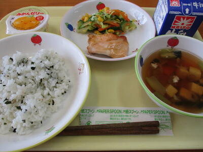 わかめごはん とりの照り焼き コーンサラダ お祝いすまし汁 オレンジゼリーミニ 牛乳