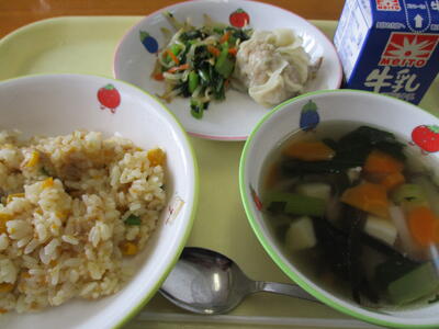 ツナチャーハン しゅうまい ナムル 豆腐スープ 牛乳