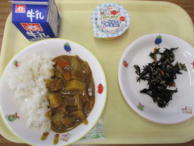 ごはん ポークカレー ひじきのマリネ ヨーグルトムース 牛乳