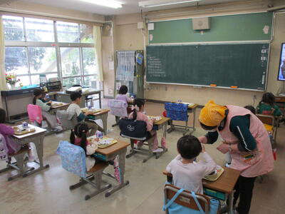 今日は1年生初めての給食です。給食当番が配膳を行い準備をしました。慎重な手つきで上手に盛り付けていました。おいしそうに食べている表情をお届けできないのが残念です。きっと保育園や幼稚園で黙食をしてきた子たちなので食事中はとても静かです。実にお行儀よく食べていました。
