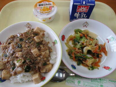 マーボー丼 ツナときゅうりの中華和え あまなつフレッシュ 牛乳