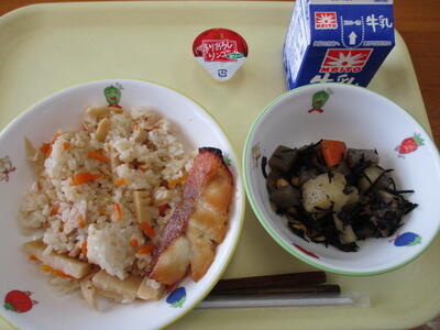 たけのこごはん あかうおの西京焼き 大豆の磯煮 一口リンゴゼリー 牛乳