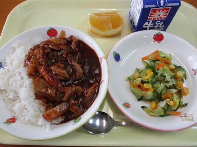 ごはん ポークストロガノフ フレンチサラダ 美生柑(みしょうかん) 牛乳