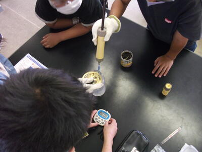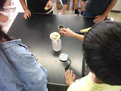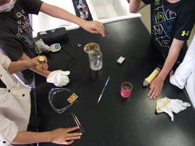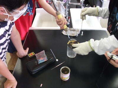 物が燃える前の空気と燃えた後の空気は何か違うのでしょうか?ろうそくの火を集気びんの中に入れ、気体検知管を使い、酸素と二酸化炭素の濃度を測定します。実験は保護メガネや軍手を用い安全第一です。実験の結果、何か違いはあったかな?
