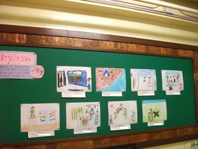 子どもたちの作品は、教室前の廊下掲示することが多いですが、職員室前の掲示板や、中央階段の壁面に掲示してある作品もあります。学校にお越しの際は、子どもたちの頑張りを見ていただければと思います。