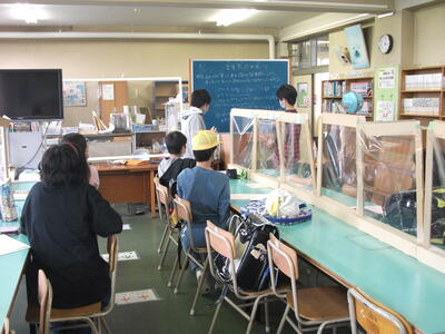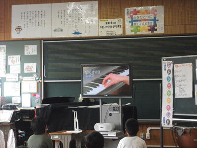 3年生が音楽の授業です。席の間をあけてソーシャルディスタンスをとっています。けんばんハーモニカの練習も、今日は指づかいだけ…。普通の音楽ができるのはいつになるのやら。