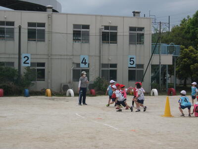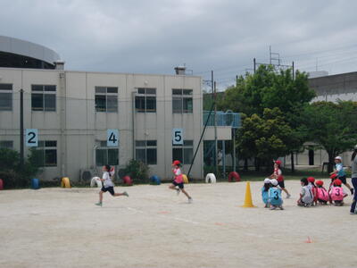 バトンはリングタイプのものを使います。1.2年生は半周ずつ、3年生は1周走ります。3年生は終盤になってからががんばりどころです。バトンの受け渡しはまだまだ練習が必要ですね。これからしっかり練習して、本番ではカッコいい走りを見せてくださいね( `ー´)ノ