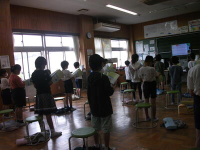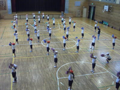 運動会の練習もいよいよ大詰め。でも雨のため、外での練習はできません。1,2年生は、手に色鮮やかなポンポンをつけて踊ります。キラキラ光ってとてもきれいです。隊形移動もあります。最後にカッコよくポーズを決めてくださいね。