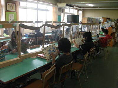 二俣小には第1から第3まで三つの図書室があります。本の種類ごとに部屋が分かれています。一番メインの第1図書室は向かいには飛沫防止のついたてが設置してあります。でも、必要がないくらい静かに本を読んでいます。