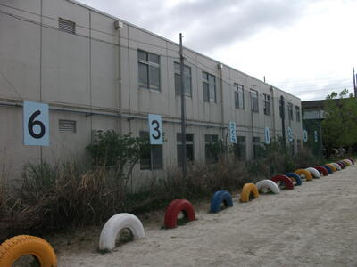 何かあった時には、校庭に避難します。集合場所は二俣幼稚園側のフェンスに表示されています。この表示板は4月いっぱい来ていただいていた用務員さんがリニューアルしてくださいました。