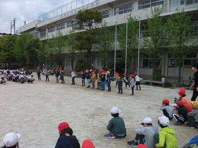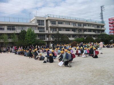 今日は引き渡し訓練なので、ランドセルなどの荷物を持ち、外履きに履き替えて集合しました。火災など緊急を要するときは、荷物も持たず、上履きのまま避難します。どの学年の子もおしゃべりせず、静かに歩いています。立派です。新しい教室からの避難経路をしっかり覚えてください。先生がいない時や、休み時間に地震が起こるかもしれません。真剣に訓練に取り組み、いざというときには、自分で自分の命を守れるようにしていきましょう。
