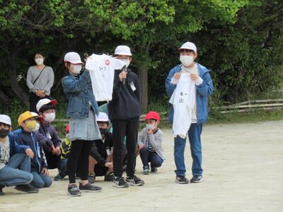 体操服の大きさを比べています。6年間の成長はすごいですね。6年生は、1年から6年の始めの5年間で身長が40センチも伸びたそうです。