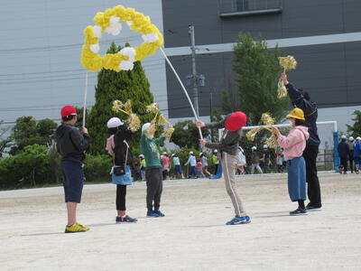 いろいろ落ちてきたものを思い思いのポーズでキャッチしています。「二俣小!」う~ん、むずかしい…