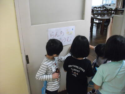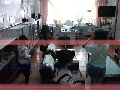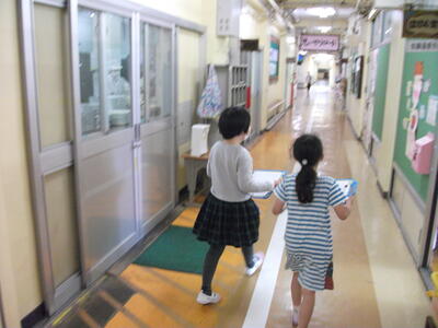 2時間目には、1年生と2年生が学校探検をしました。先輩の2年生が、1年生を案内しています。「ここは〇〇〇。△△△するところだよ。」教室の説明もしています。行った教室には、カードにシールを貼るのですが、1年生はそっちに夢中の子もちらほら…。しっかり聞いて覚えてくださいね。