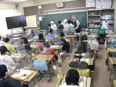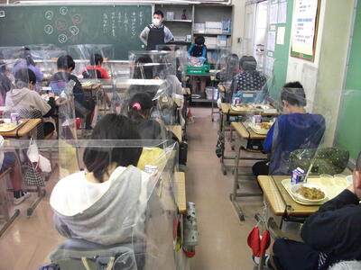 6年生は、38人と人数が多く、周囲の人との間が狭くなるため、今年から写真(見づらいかもしれませんが)のような「飛沫防止ガード」を使用し、さらに黙食を実行することで感染拡大の防止に努めています。これまでのような会話を楽しみながら給食を食べる日が来るのはいつになるのでしょう…。