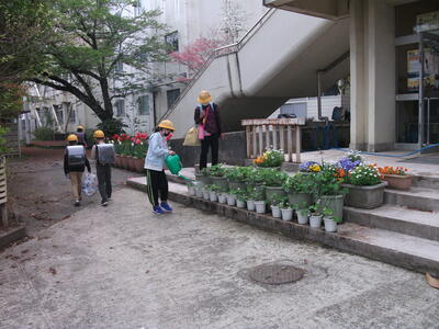 環境委員会では、当番を決め、登校してから始業までの間に昇降口のお花に水をあげています。朝早くからありがとうございます。