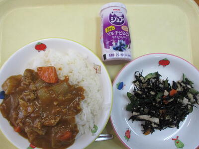 チキンカレー ひじきのマリネ 一口レモンゼリー 牛乳