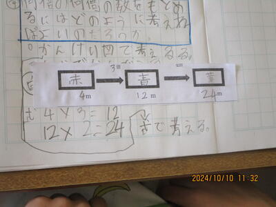 1年生が算数の学習で、テープを使って長さを比べていました。「先生の机を廊下に出したいんだけど、入り口を通せるかな?」という疑問をテープを使って解決したあとに、いろいろなところの長さを比べてみました。2年生になると、長さの単位「cm」、「mm」や1cm=10mmなどを学習していきます。