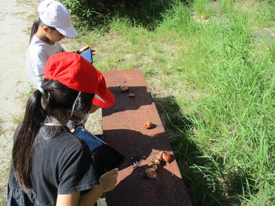 外の木陰では、落ち葉で遊ぶ2年生。散らかしたらお掃除もしてくださいね( ̄▽ ̄)
