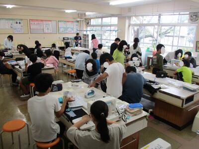 5年生は家庭科でミシンを使ってのエプロン制作に取り組んでいます。初めて使うミシン!教えてくれる人が多ければ多いほど一人一人に対応できます。今回は地域ボランティアの方々にご協力いただき、順調に作業を進めています。ご協力ありがとうございます。今度は自分で作ったエプロンで調理にも取り組みたいです。その時もぜひよろしくお願いいたします<(_ _)>
