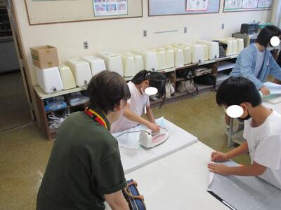 1年生が、ほかけぶねづくりに取り組んでいました。身近にある材料を使って、帆と胴体を組み合わせていきます。はさみやのり、テープなどの使い方が上達してきました。みんな黙々と製作しています。