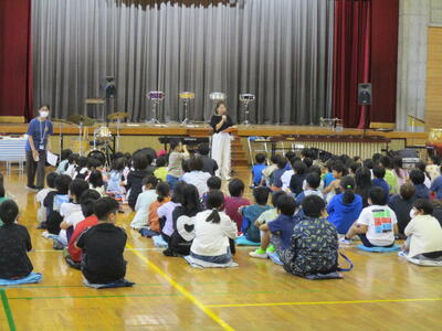 「剣の舞」の演奏を皮切りに、打楽器のスーパーテクニックを見せていただいたり、いろいろな打楽器を紹介していただいたりしました。台所用品やお掃除道具も楽器に早変わり!まさに音を楽しみました。