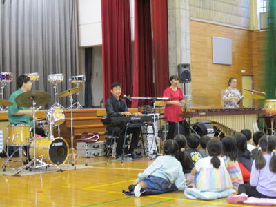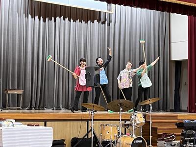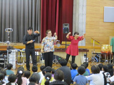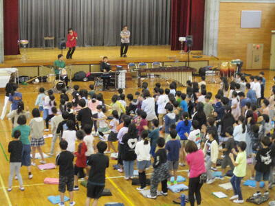 また、6年の先生のエピソードを即興で歌にしたり、校歌がいろいろなバージョンにアレンジされました。先生たちもステージに上がり、アレンジされた校歌に合わせ、ダンスを披露してくれました。全校でのボディーパーカッションなど体を動かして楽しみました。あっという間の1時間でした。フラワービートの皆様、五感で楽しむ音楽をありがとうございました。