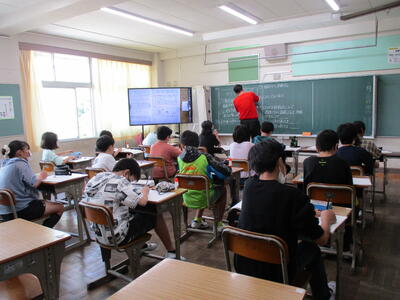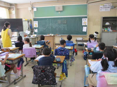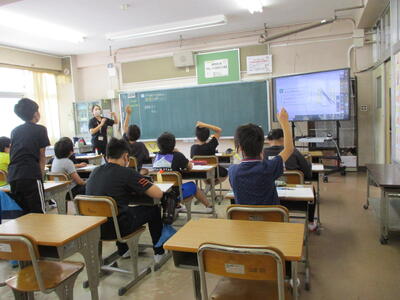 外国語活動の授業の様子です。今日は4年生が曜日の言い方の学習をしています。目と耳と体で覚えていきます。子供たちは適当に言っているようですが、耳から聞いた音を真似しているので発音がいいです。こんな学習を小さいころからしていたら英語が話せたのかな…なんて思ってしまいます。