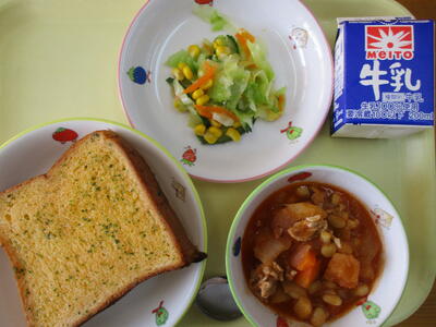 ガーリックトースト ポークビーンズ コーンサラダ 牛乳