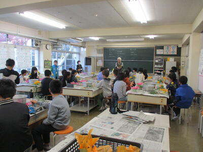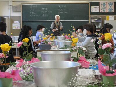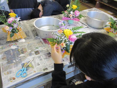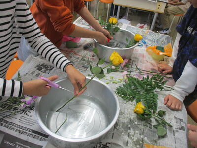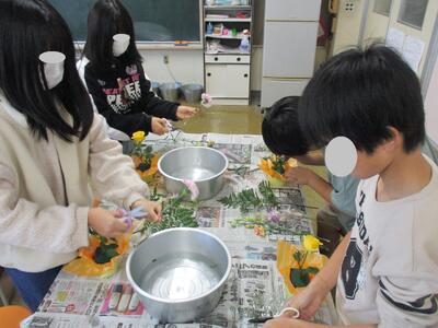 6年生…地域のお花の先生をお招きして生け花教室を行いました。最初はおそるおそるでしたが、だんだんと大胆に花を生け、個性豊かないい作品が仕上がりました。ご指導ありがとうございました。