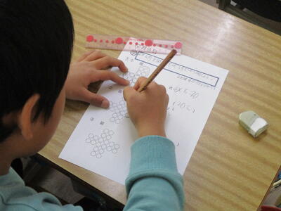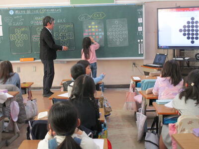 2年生…「かけざん」の学習です。かけ算を使って、〇の数を考えます。たくさんの考え方が出てきました。答えの出し方にはいろいろな方法があります。友だちの考え方もしっかりと聞いていました。