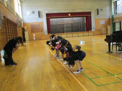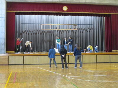 健康委員会…全校のみんなに健康な生活を呼びかける集会のリハーサルをしています。
