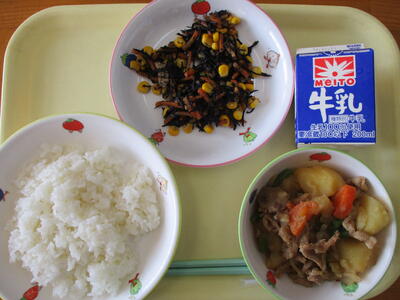 ごはん ひじきとコーンの炒め煮 肉じゃが 牛乳
