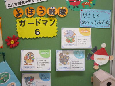 具合が悪くなったり、けがをしたりした時にお世話になる保健室。保健室の前にはためになる掲示物がたくさんあります。時期によって替わるので時々見て、生活に生かしてみてください。