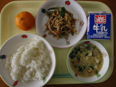 ごはん チンジャオロースー にら玉スープ みかん 牛乳