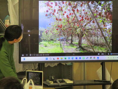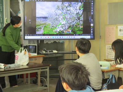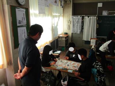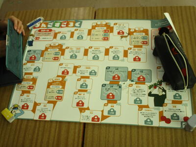 4年生は、梨についての学習をしているので、関連付けて考えていました。また、物流についても学習するので、社会や理科などたくさんの要素が含まれていました。独自に製作されたリンゴの育て方の「すごろく」をしながら、学習していきました。とまったコマに書かれている内容をしっかり読みながら楽しく学習できました。