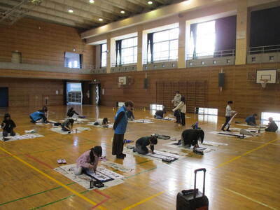 今日は、3・4年生が体育館で書初めの練習に取り組みました。地域の方を講師としてお招きしています。