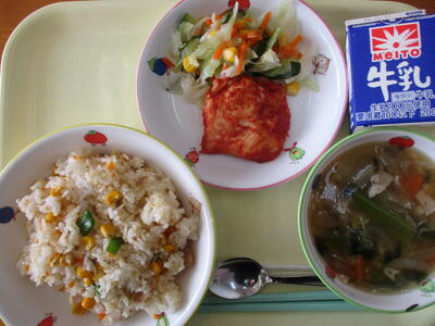コーンピラフ タンドリーチキン フレンチサラダ ABCスープ 牛乳