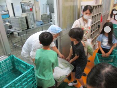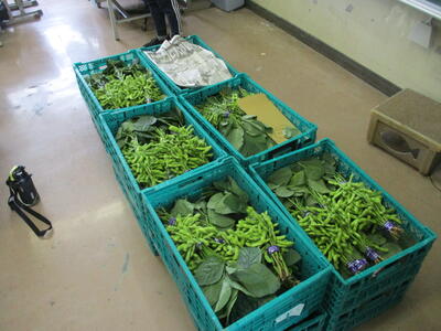 今日の朝に、3年生が給食に出す枝豆のさやもぎをしました。朝、栄養士の先生からこれからさやもぎをする枝豆の山を見せられ、びっくりぎょうてん!!こんなにたくさん…。「二時間目までかかりそうだな…」というつぶやきも聞こえました。最初は戸惑っていた3年生も、慣れてくるとグループの中で自然と役割を分担し、効率よく作業を進めていきます。1年生との違いに感心させられました。山ほどあった枝豆も一時間目の中でもぎ終わりました。みんなやり切った満足感でいい顔をしていました。給食室に届けておいしくゆでてください、とお願いしてきました。お疲れさまでした。