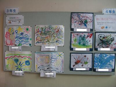 子どもたちの作品は、教室前の廊下掲示することが多いですが、職員室前の掲示板や、中央階段の壁面に掲示してある作品もあります。学校にお越しの際は、子どもたちの頑張りを見ていただければと思います。