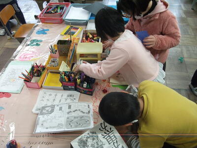 3年生の教室では、理科の学習で、種の観察をしたり、社会科の学習で、地図を使って学校の周りの様子を学習したりしています。どちらのクラスも色鉛筆を使ってきれいに仕上げています。
