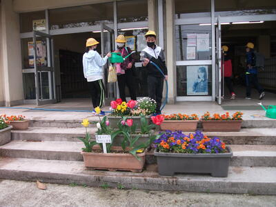 環境委員会では、当番を決め、登校してから始業までの間に昇降口のお花に水をあげています。朝早くからありがとうございます。