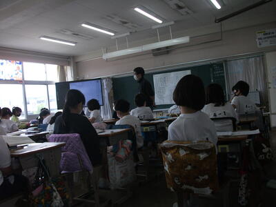 4年生の教室では、国語の学習です。お話を読んで、自分の考えたことをまとめています。しっかりと発表することもできていました。