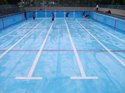 今日は、明日からの水泳指導に向けて、二俣小職員総出でプール清掃を行いました。今年は、5月にプール内壁の修理を行ったため、例年のような葉っぱやヘドロの堆積はほとんどありません。短時間でいつもの色を取り戻しました。