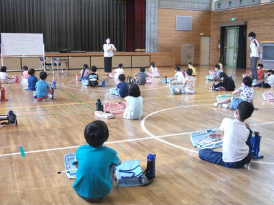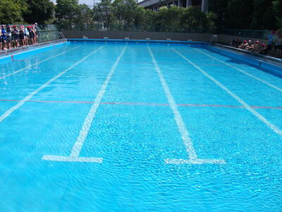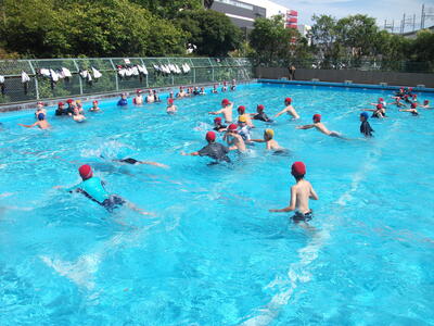 梅雨明けの今日、天気が良く、気温も上がりましたが、風もあり、昨日のように熱中症アラートの発令には至りませんでした。好天に恵まれ、1,2年生が初めての水泳指導を行いました。