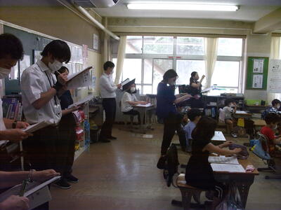6年生は、午後から高谷中に「平和講演会」を聴きに行く予定でしたが、Teamsを使い、リモートでの視聴となりました。まだ、社会科で戦争についての学習をしていないため、少し難しい話でしたが、頑張って聴いていました。世界に目を向けると現在進行形の地域もあるので、そのあたりも意識して聴いていればよいのですが…。体験者も年々少なくなっていきます。生の声を大切にしていきたいです。