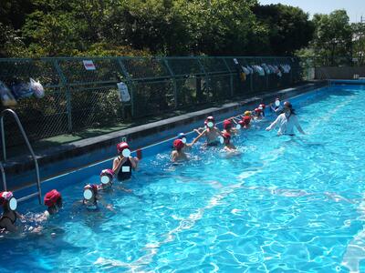 プールの中の水は、それほど冷たくないので、唇を紫にして震えている子は一人もおらず、最後まで全員で水泳の授業を行えました。たくさん体を動かしたので、おうちに帰ってお昼寝したかもしれませんね。ヽ(^。^)ノ