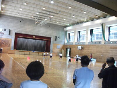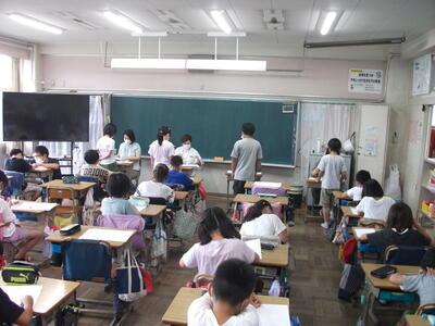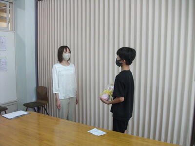 この会終了後、二俣小のみで朝会を行いました。学校だよりでもお知らせしましたが、養護教諭が8月20日をもって退職となります。短い間でしたが、ありがとうございました。健康委員会の委員長が、花束を手渡しました。