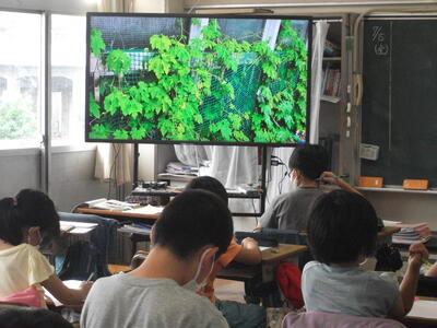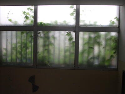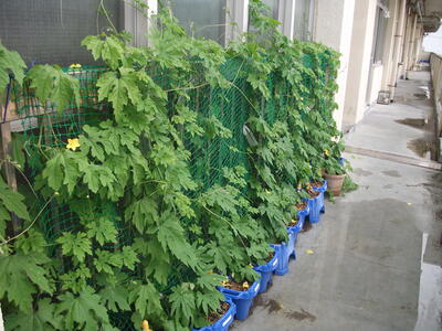 二俣小の中央階段の、2階から3階へかけての窓にこんもりとした緑色の影が見えます。ベランダに回ってみると、4年生のゴーヤ(ツルレイシ)がどんどん成長しています。花も咲き、小さな実ができています。ゴーヤーチャンプルーが食べたくなりました。