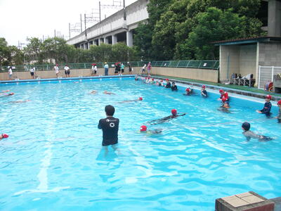 服を着たまま水に入るのは、水に落ちるなどのアクシデントになります。こういう時に落ち着いて対応できるように、水に慣れていってください。